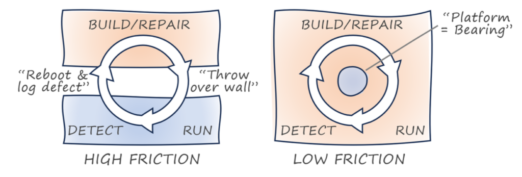 As the left side of the diagram shows, the loop across deploying software, detecting its operational characteristics (or usage metrics), and correcting them, spans two organizational units whose opposing incentives pit them against each other. Often referred to as the “outer loop” of software delivery (the “inner” comprising the code/test/debug), modern software approaches like continuous integration place higher demands on making the outer loop spin faster and with less friction. In a traditional organizational model, the outer loop crosses organizational boundaries and inhibits these new ways of working.